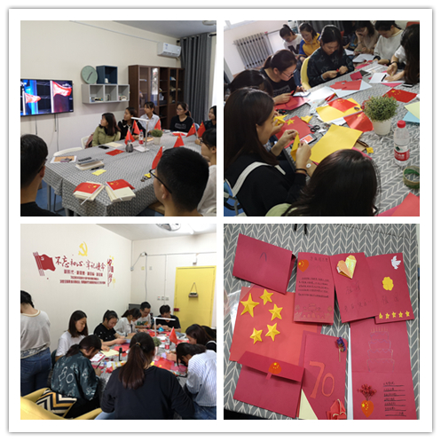 活动第二项,全体党员同志积极参与,剪出白鸽、五角星、70等图案,绘画五星红旗、生日蛋糕,用干花,折纸作装饰,制作出精美的贺卡,并写下了自己对祖国的衷心祝福。制作过程中,各党员同志相互协助,气氛融洽,共同为祖国庆祝生日、送上祝福。
