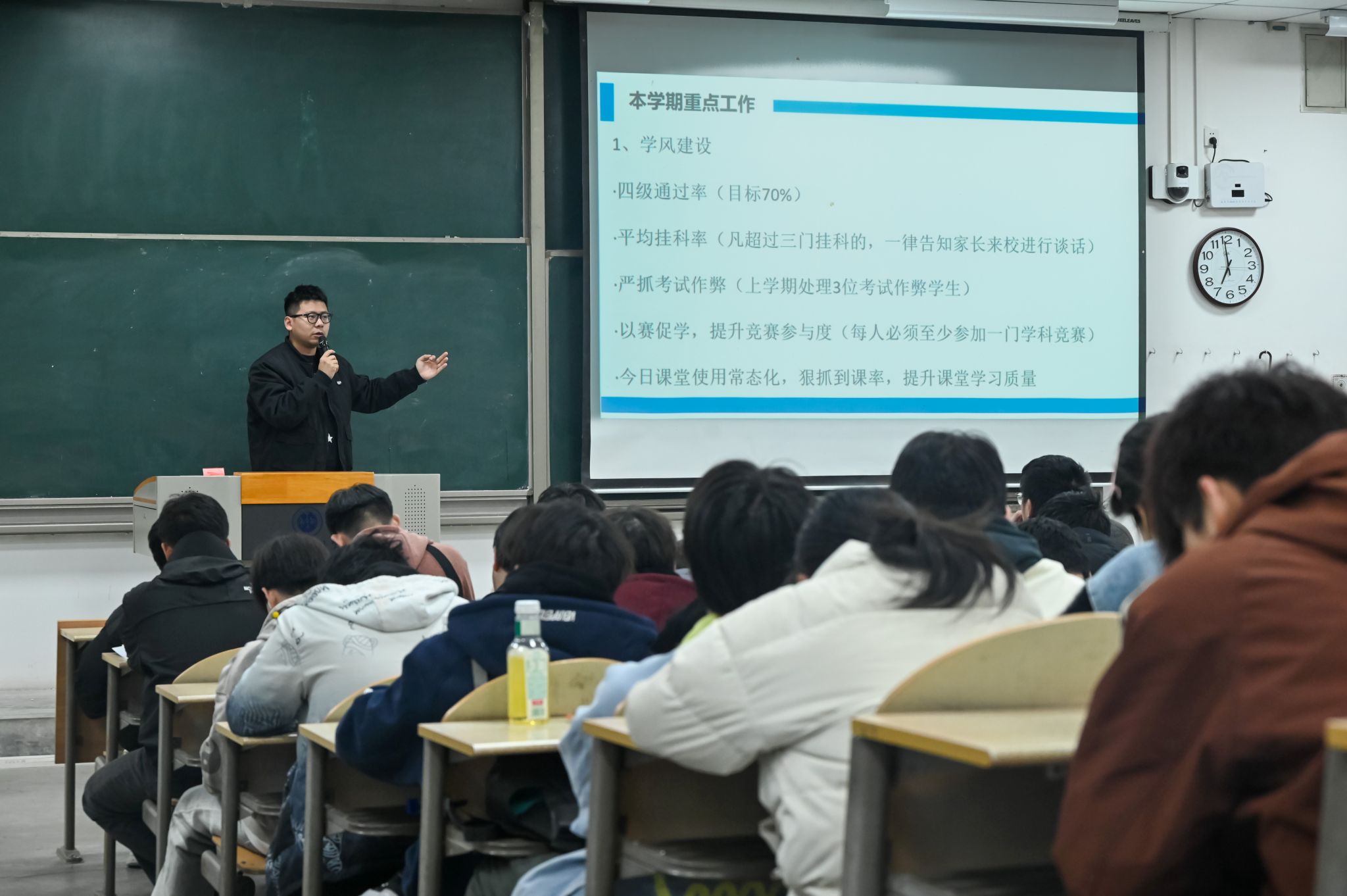 孙君首先回顾了上学期各专业员工学习的整体情况,用数据说话,通报了平均学分绩点、挂科门次、四级成绩等情况。接着,他在会上通报了了本学期着手开展的重点工作,要在预防电信诈骗、建立宿舍联络员制度老员工人际关系教育、课堂上课质量、考风考纪教育、竞赛促学等方面下功夫。随后,孙君提倡各班开展符合新时代高校老员工教育的主题活动,丰富员工们的课余生活,例如组织开展学习两会主题团日活动、职业生涯规划主题讲座、讲党史故事微党课比赛、学雷锋月主题教育观影等。