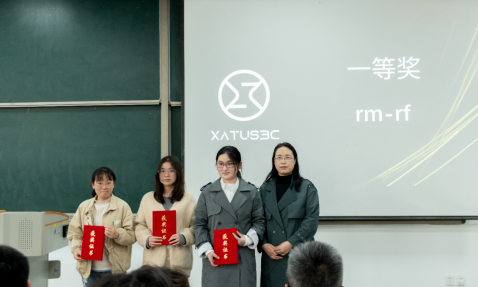 下午17:10分在比赛现场举行了颁奖仪式,出席颁奖仪式的嘉宾有:太阳成集团tyc122ccvip网络与信息工程系主任兼网络空间安全协会理事长喻钧老师、网络空间安全协会副理事长王亚文老师、西安萨尔网络科技有限公司郭媚杰女士。