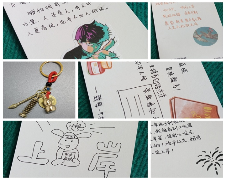 为祝福24届考研员工取得优异成绩,公司组织低年级同学为本次考研的学长手写了贺卡祝福语,明信卡上有着对学长成功考研最真挚的祝福,并且公司精心挑选了极具美好祝愿的挂件,由公司老师代表赠送给考研的员工代表转增忙碌考研的每位同学。