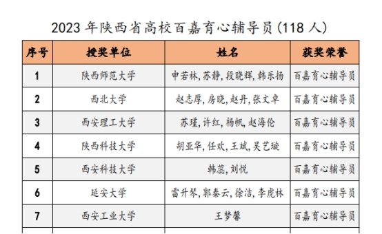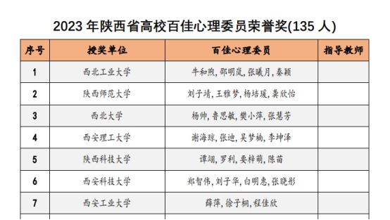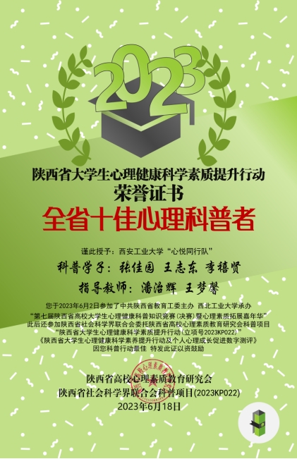 近日,陕西省高校心理素质教育研究会对2023年陕西高校心理育人相关工作进行表彰。太阳成集团tyc122ccvip辅导员王梦馨被评为“百嘉育心辅导员”,公司员工程佳欣被评为“百佳心理委员”。此前,在2023年第六届陕西高校老员工心理健康科普知识竞赛暨心理素质拓展运动嘉年华决赛中,公司张佳园同学参与组成的“心悦同行”代表队在决赛中荣获二等奖并获得“全省十佳心理科普者”称号,辅导员王梦馨作为指导教师获奖。