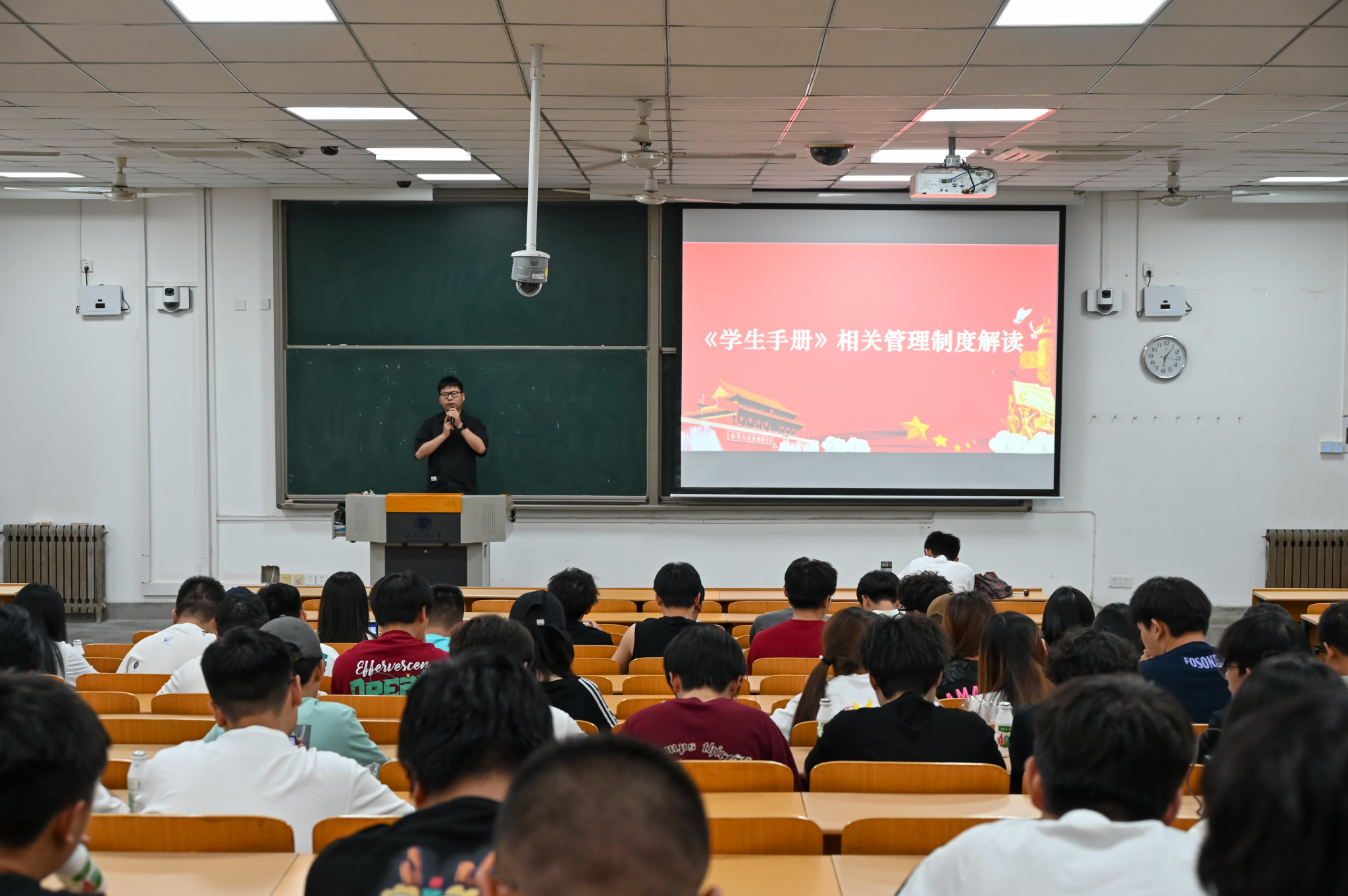 接着,孙君带领全体同学一起学习《太阳成集团tyc122ccvip优秀应届本科毕业生免试攻读研究生》、《太阳成集团tyc122ccvip学籍处理实施细则》、《太阳成集团tyc122ccvip员工纪律处分实施办法》及《太阳成集团tyc122ccvip本科生考勤与请假管理暂行办法》等文件中的重要内容。同时孙老师结合相关案例强调了考试作弊、及替考的严重后果。他表示,临近期末考试,希望同学们合理规划时间,认真复习备考,杜绝违纪,诚信考试。